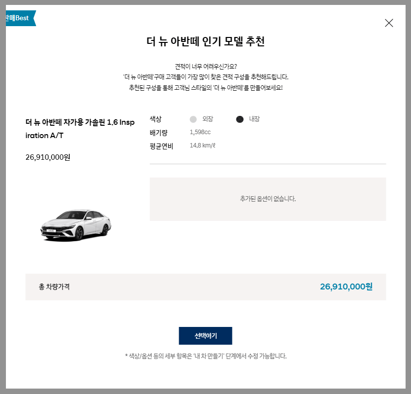 원하시는 모델과 옵션을 선택하여 아반떼의 모의견적을 확인하실 수 있습니다.